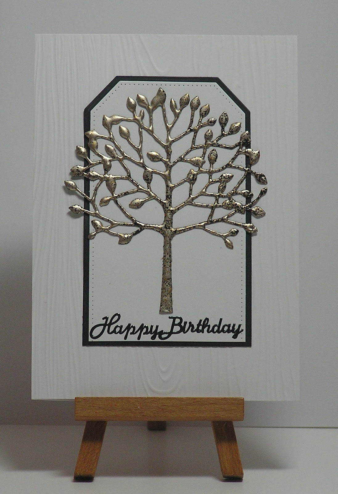 MFT tag stax die; Memory Box Arboscello tree die; {a[ertrey Ink woodgrain texture plate; aged silver frantage embossing enamel; sentiment sticker.